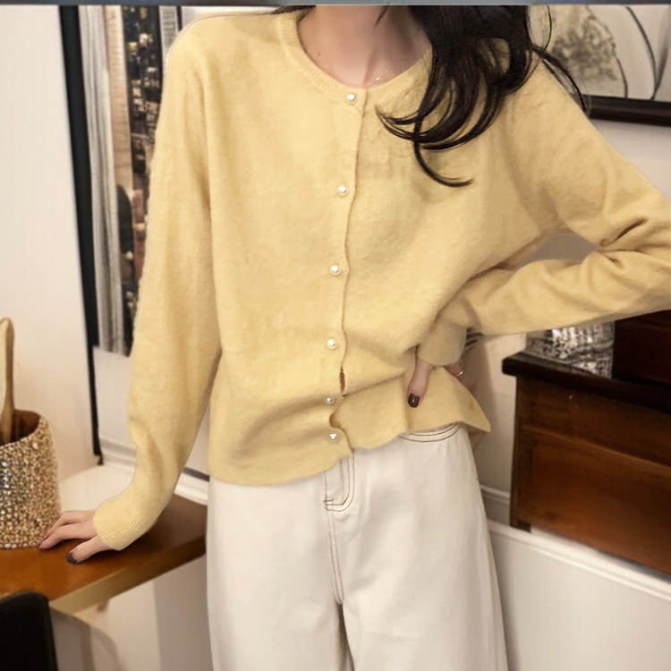 여성 니트 가디건 긴팔 솔리드 상의 진주 버클 여성 봄가을 라운드 니트 가디건 부드러운 니트 코트