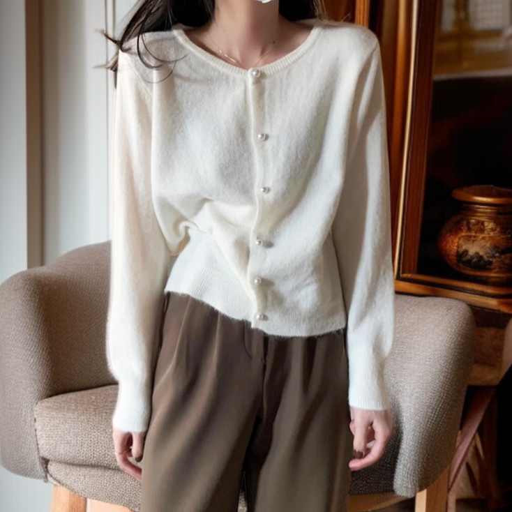 ● 진주 버클 디자인으로 우아함이 돋보이며, 봄가을 시즌에 다양한 스타일링이 가능한 여성 니트 가디건입니다.